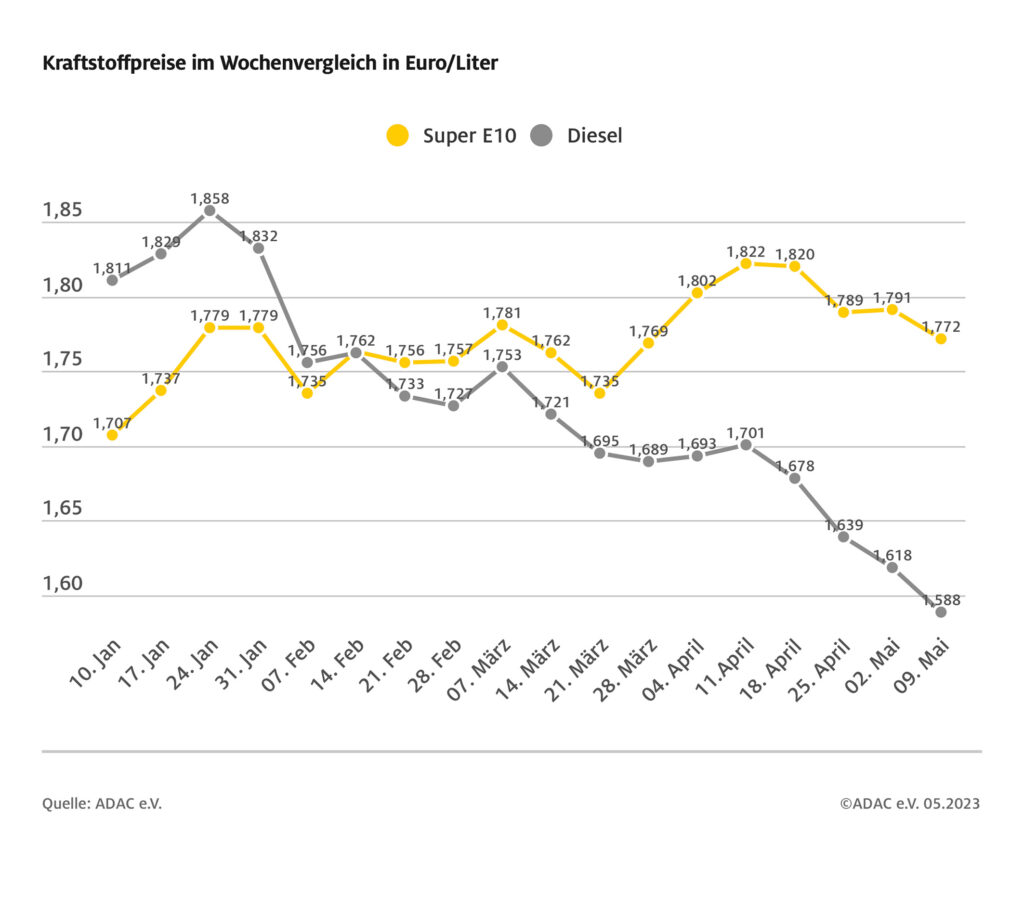 München (ots) – An den Zapfsäulen setzt sich die Entspannung weiter fort, die Preise beider Kraftstoffsorten sind im Vergleich zur Vorwoche erneut gesunken. Besonders deutlich hat – wie in den Vorwochen – der Preis für Diesel nachgegeben. Wie die aktuelle ADAC Auswertung der Kraftstoffpreise in Deutschland zeigt, kostet ein Liter Super E10 im bundesweiten Mittel 1,772 Euro, das sind 1,9 Cent weniger als in der vergangenen Woche. Diesel ist sogar um drei Cent günstiger und kostet aktuell im Schnitt 1,588 Euro.