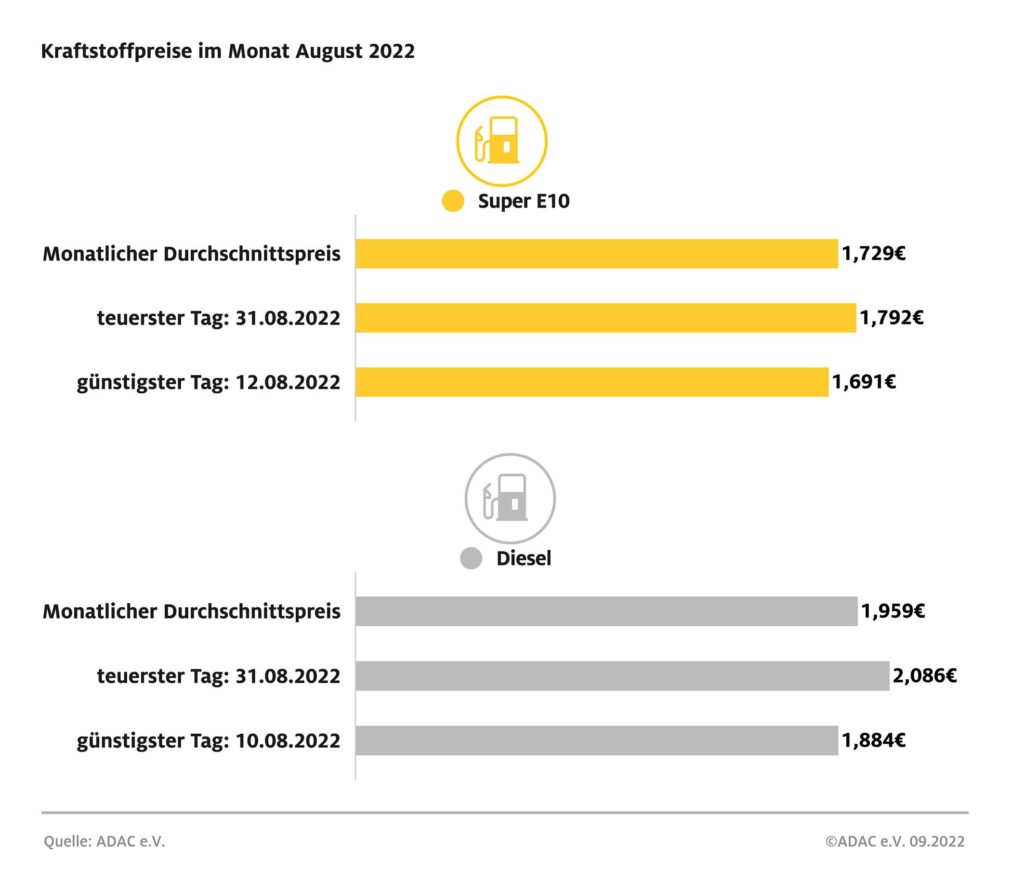 München (ots) – Der teuerste Tag zum Tanken im August war für beide Sorten der letzte Tag des Monats. Bereits zwei Wochen vor dem Auslaufen des Tankrabatts stiegen die Preise seit Monatsmitte kontinuierlich an und fanden am 31. August ihren Höhepunkt mit 1,792 Euro für den Liter Super E10 und 2,086 Euro je Liter Diesel. Deutlich günstiger waren die Spritpreise noch kurz vor Monatsmitte. Für Super E10 mussten Autofahrer am 12. des Monats mit 1,691 Euro je Liter am wenigsten bezahlen. Diesel war am 10. August mit 1,884 Euro je Liter am günstigsten. Der deutliche Anstieg von rund 10 Cent bei Super E10 und von gut 20 Cent bei Diesel vom günstigsten auf den teuersten Tag im August dürfte auch mit dem Auslaufen der steuerlichen Vergünstigungen auf Sprit zusammenhängen.