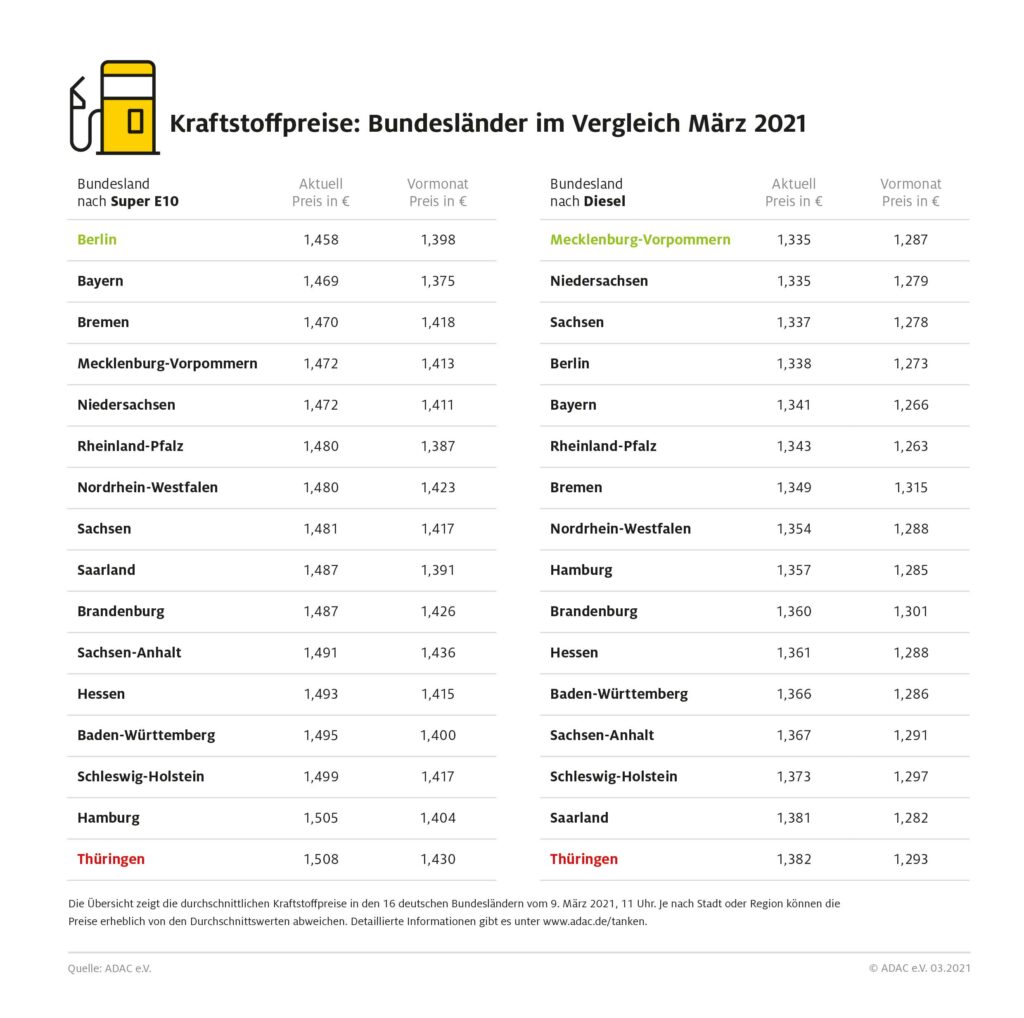 Ein uneinheitliches Bild zeigt sich bei den günstigsten Bundesländern: Benzin ist laut ADAC Auswertung momentan in Berlin am preiswertesten. Ein Liter Super E10 kostet in der Bundeshauptstadt 1,458 Euro, gefolgt von Bayern mit 1,469 Euro und Bremen mit 1,470 Euro. Dieselfahrer tanken in Mecklenburg-Vorpommern und Niedersachsen am preiswertesten. Diese Bundesländer liegen mit einem Durchschnittspreis von 1,335 Euro gleichauf. Dritter ist Sachsen mit 1,337 Euro.